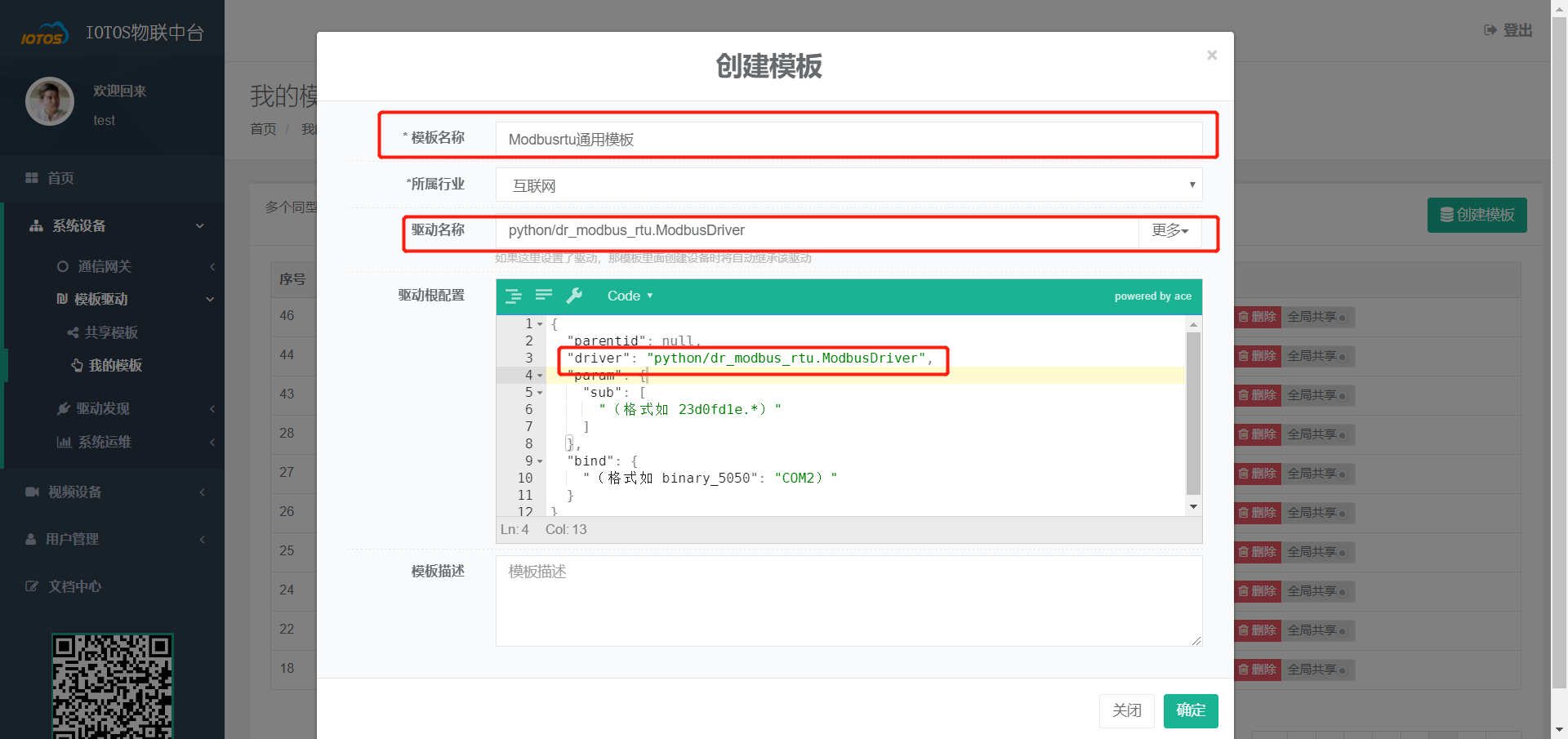 - 进入IOTOS中台,测试账号为iotos_test,密码为iotos123(也可以创建自己的账号),依次点击【系统设备】->【模板驱动】->【我的模板】,点击右上角创建模板,填写模板名称和模板根配置里面的“driver”参数,该参数表示要运行的驱动,本实例用到的是modbus驱动(该模板中台自带,参数与图片中保持一致即可)