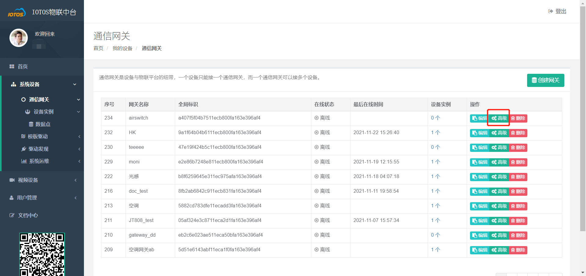 方式二:点击中台【系统设备】->【通信网关】,选择刚刚创建好的网关,点击高级,开启云网关,密码为账户密码。
