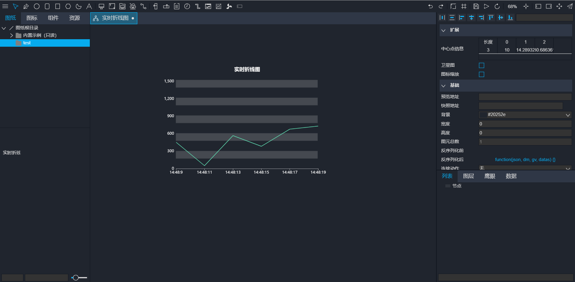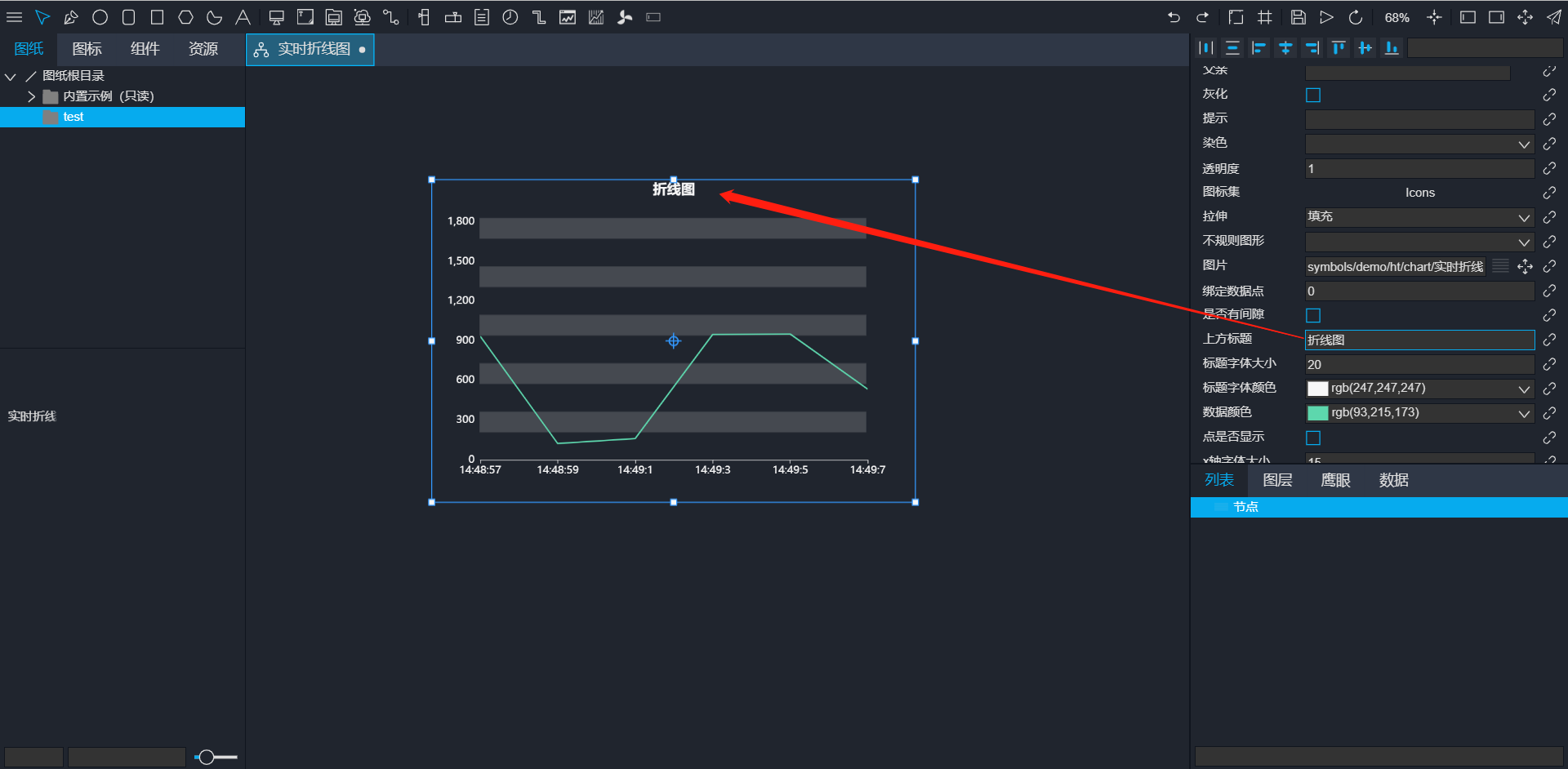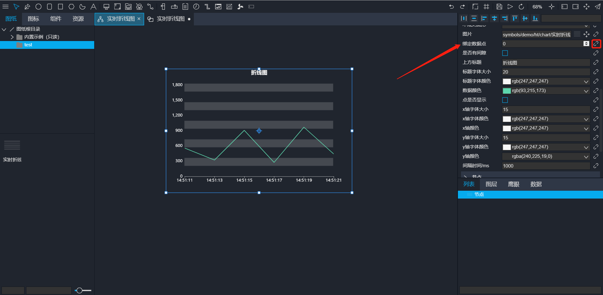 实时折线图 新建图纸选中左上方默认样式中的实时折线图拖到编辑区域内即可看到默认样式可编辑属性更改折线图样式绑定中台数据数据绑定后运行效果如下中台数据如下 下发按钮 新建图纸选中左上方默认样式中的下发按钮拖到编辑区域内即可看到默认样式绑定中台数据,打开事件处理使用效果,按钮或者回车都可以下发作者:IOTOS 创建时间:2022-03-07 11:53最后编辑:IOTOS 更新时间:2023-11-29 09:38