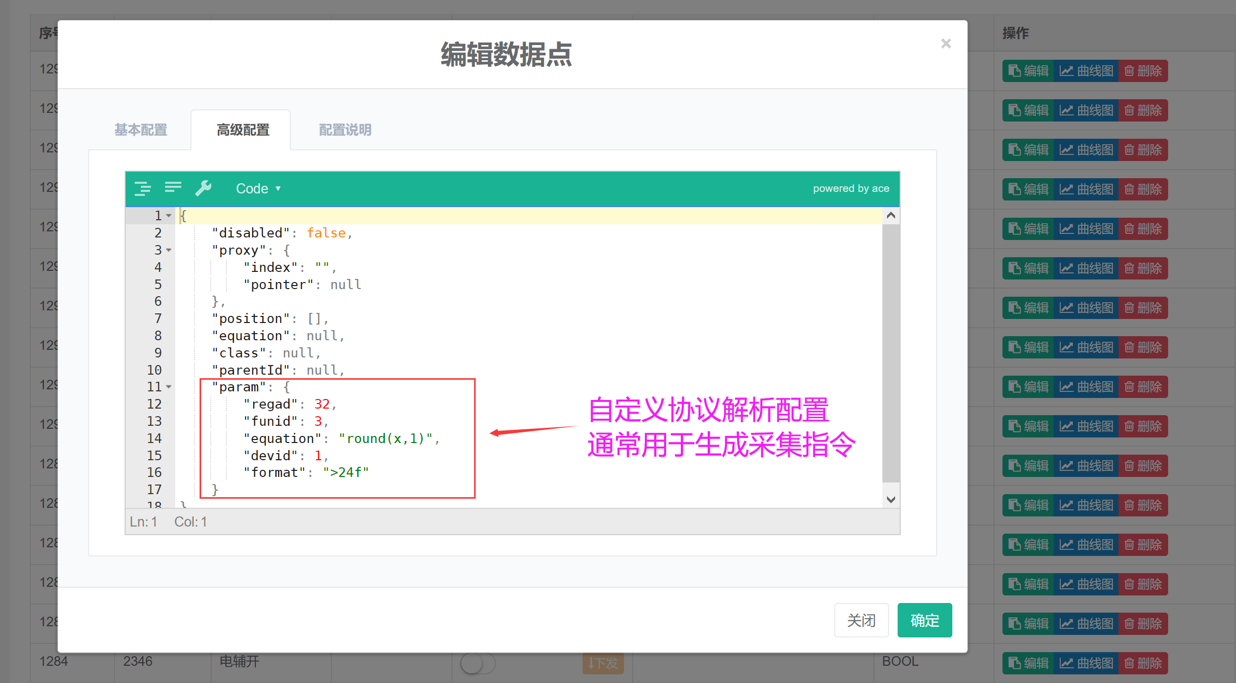 每个数据点有“基础配置”和“高级配置”,与驱动接口协议解析关联最大的为高级配置中param字段下的自定义配置内容,尤其是发生在需要主动下发采集的情形。