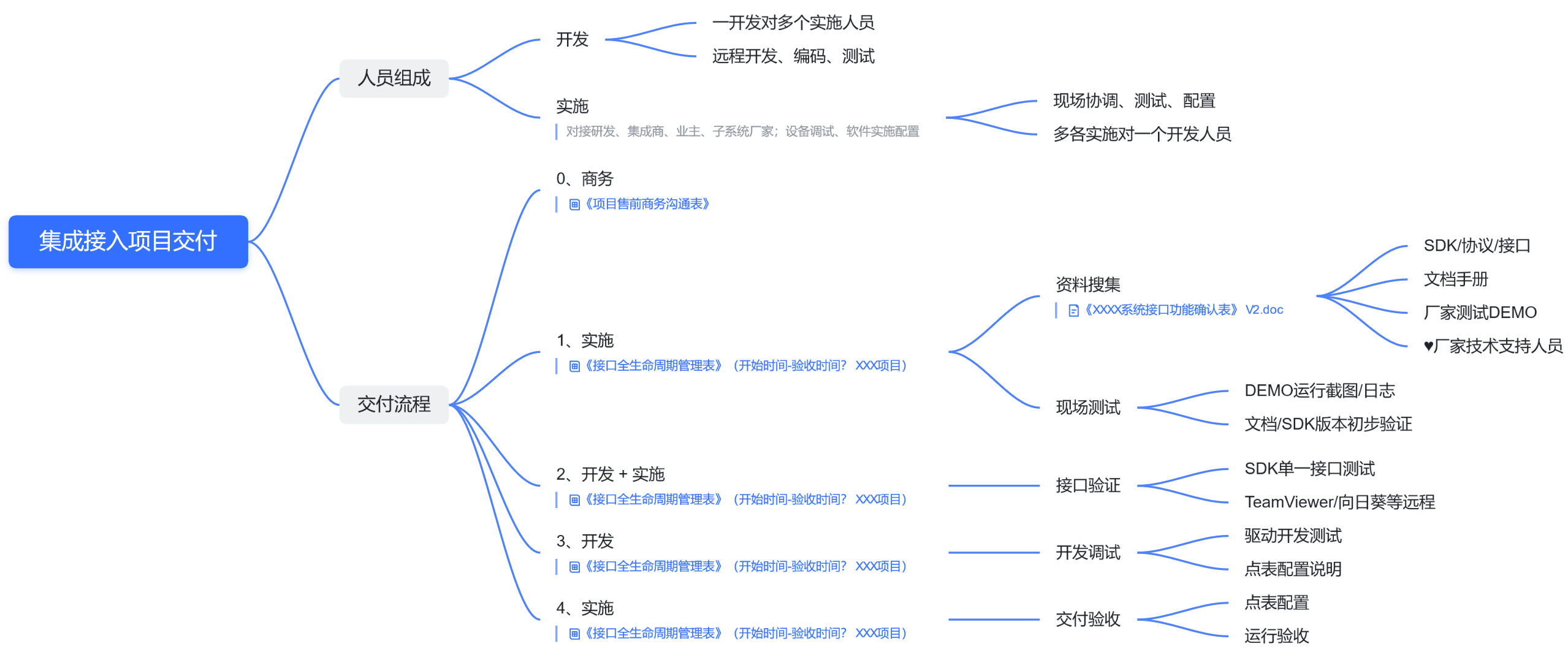 设备接入相关的项目交付通常分为开发交付和实施交付两个阶段,分别也常对应不同角色的人员参与: